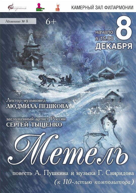 8 декабря в Камерном зале филармонии прозвучит одно из самых проникновенных произведений русской литературы — повесть Александра Пушкина «Метель», переложенная на музыку выдающимся композитором Георгием Свиридовым в исполнении музыковеда филармонии Людмилы Пешковой и заслуженного артиста РФ Сергей Тыщенко.