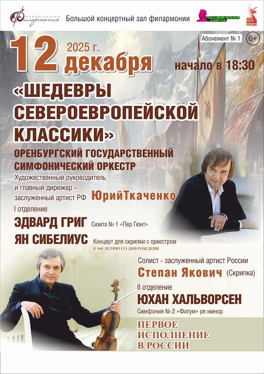 12 декабря в Большом концертном зале филармонии состоится концерт "Шедевры североевропейской классики" Оренбургского государственного симфонического оркестра. Художественный руководитель и главный дирижер – заслуженный артист России Юрий Ткаченко.